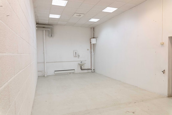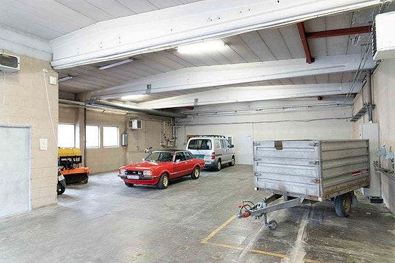 Fint lagerbygg på 292 kvm, inndelt i et stort lagerrom og to mindre rom på hhv. ca.16 kvm og 43 kvm. Se plantegning i annonsen som pdf. Fjernvarme.